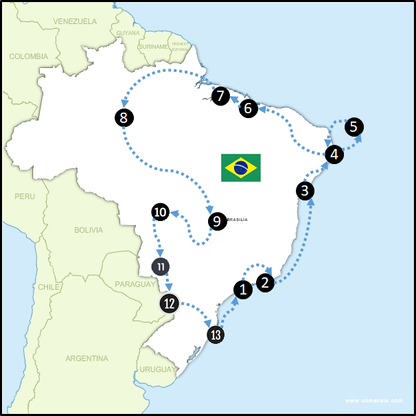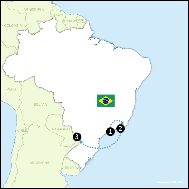 Commencez votre circuit par São Paulo (1), haut lieu culturel, qui ravit aussi les gourmets et les noctambules. Prenez ensuite l’avion pour rallier votre point d’orgue du voyage : Rio de Janeiro (2). Copacabana, Ipanema, ses restaurants et sa scène musicale vous feront vite oublier le long voyage que vous venez d’avoir.