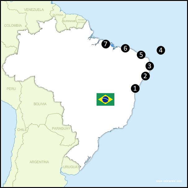 Rejoignez ensuite Salvador (3), le joyau afro-brésilien du pays. Le cœur de la cité bahianaise est animé par ses percussionnistes de rue et ses nombreuses fêtes. Prenez l’avion dans la ville de Recife (4) pour rallier l’archipel Fernando de Noronha (5) ; où vous pourrez vous adonner au snorkeling ou à la plongée dans un cadre idyllique. De retour sur le continent, suivez la côte jusqu’aux dunes du Parque Nacional dos Lençóis Maranhenses (6), ces magnifiques dunes de sable donnant sur la mer.