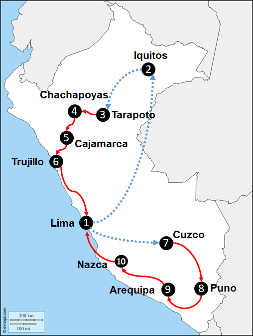 Cet itinéraire très complet couvre les sites phares du Pérou. Assurez-vous de disposer d’un bon mois pour ne rien manquer.