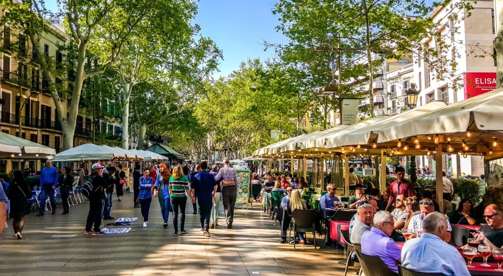 Les Ramblas de Barcelone sont une avenue emblématique, animée et piétonne, s’étendant sur environ 1,2 km. Bordées de cafés, de restaurants, de boutiques et de stands de fleurs colorés, elles offrent une atmosphère vibrante. L’avenue est un lieu de promenade populaire, où les visiteurs peuvent se mêler à l’animation de la ville, profiter des artistes de rue, découvrir des marchés pittoresques et admirer l’architecture environnante. Il s’agit d’un véritable symbole de l’essence et de la vie de Barcelone.