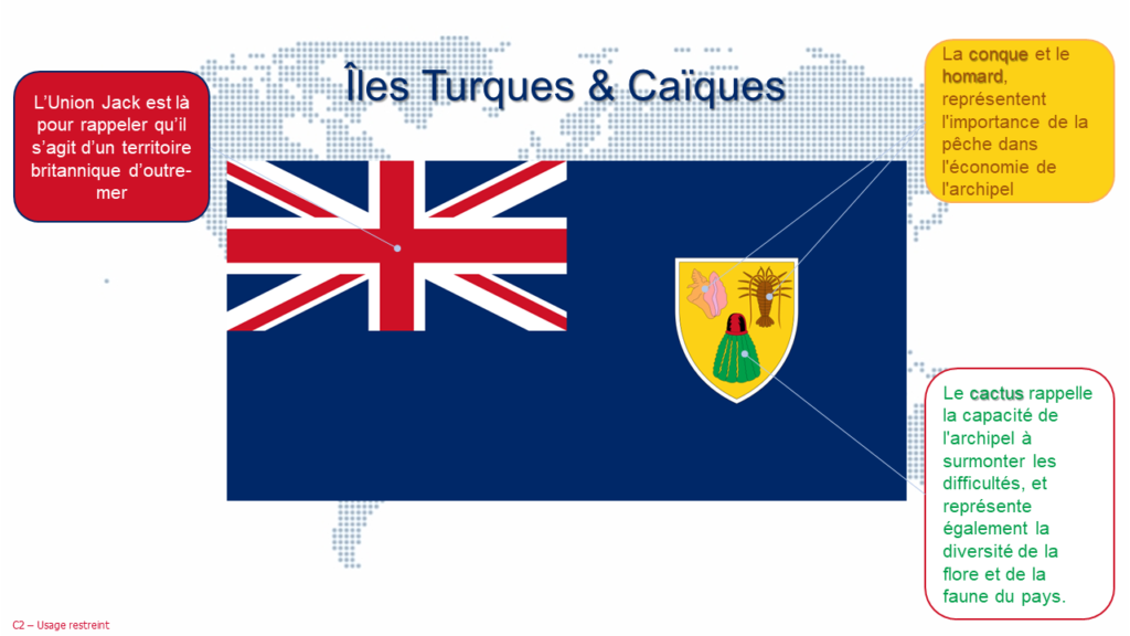 Le drapeau des îles Turques-et-Caïques ressemble à une friandise colorée, avec son bleu foncé chatoyant et son jaune soleil éclatant. On dirait presque que quelqu’un a mélangé des Skittles et les a envoyés dans l’océan pour créer cette oeuvre d’art flottante. Et si jamais vous le voyez flotter au vent, vous aurez probablement envie de plonger dans les eaux cristallines de ces îles de rêve.